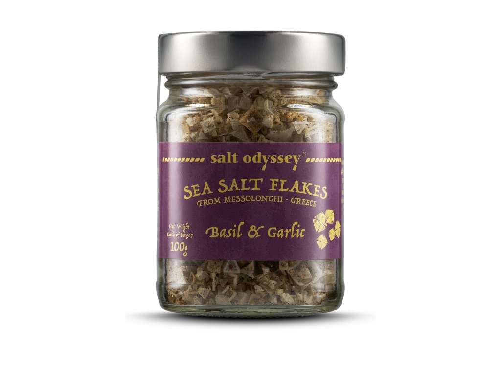 Složení: vločky mořské soli z Messolonghi 95%, bazalka 3%, česnekový prášek 2%
