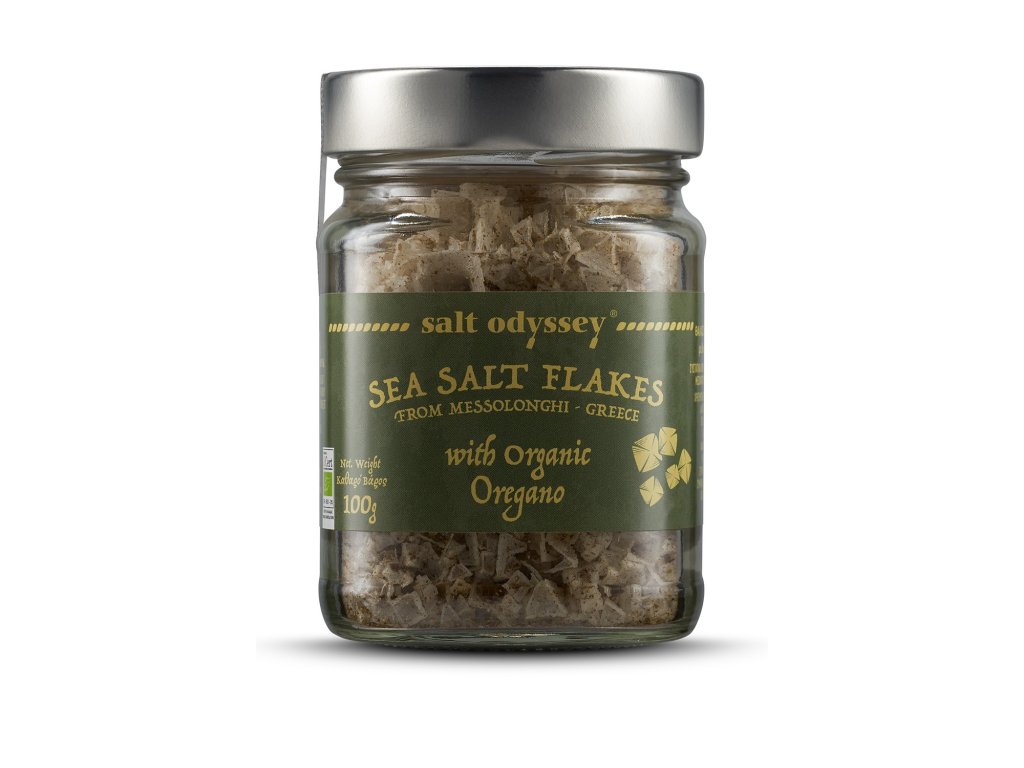 Složení: vločky mořské soli z Messolonghi 96%, BIO oregáno 4%