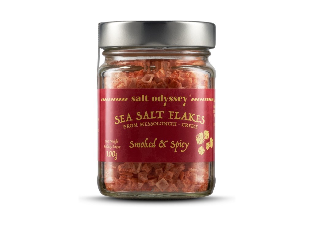 Složení: vločky mořské soli z Messolonghi 96%, uzená paprika Aridaia, červené chilli papričky